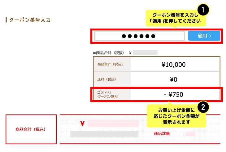 ●クーポン番号を入力していても【適用】ボタンを押していない場合、クーポンによる割引は適用されません。