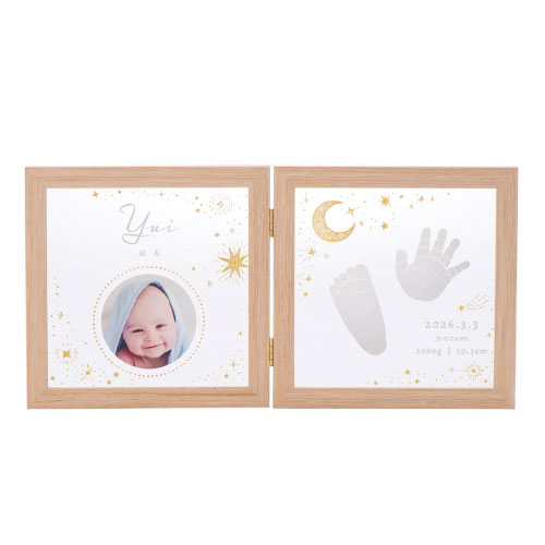 写真と手足形を片面ずつに印刷したゆとりのある仕上がり。木製のやさしい印象がナチュラル系のインテリアにも合う2面型フレームです。(スタンド専用)