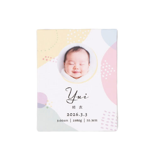 パステルカラーの風船や星がかわいいベビーらしい仕上がり。夢や希望をたくさん持ち、大きな空へ羽ばたいていきますようにと想いを込めたデザインです。(アクリルボードとBOXフレームに対応) |