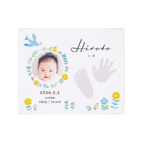 アートのような仕上がりのキャンバス。幸せの青い鳥とお花に彩られたハッピー感あふれるデザインです。(手足形無し)